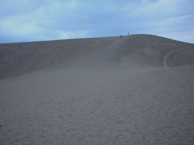 やっとのことで丘の麓まで到着し、上りに入る・・・・うぉっ、ツライ・・・・思ったより勾配が激しいぞ、こりゃぁ。運動不足の人には相当キツイ傾斜である。しかも足元は不安定な砂で、一歩進むごとにズボズボと埋まっていく・・・。ゼェゼェ言いながら頂上へ到着した。