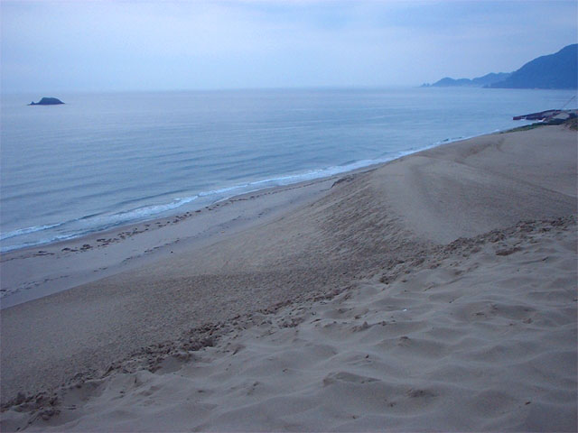 んーーーーーーー日本海だ・・・・頂上から眺める日本海は、とーってもだだっ広い!イヤ、コリャ、スゲ。砂丘頂上から海岸を望むことができるのだが、まっすぐに伸びた海岸線が何処までも続いている。そして水辺まではスザマシイ下り勾配が一気に続いていて、降りるべきか、とどまるべきか・・・迷いどころである。結局、「ここは一度降りたら二度と戻りたくなくなる」と考え(それくらい勾配が厳しいんだよ)根性無しな私は降りるのはヤメて暫くの間、ぼーっと日本海の荒波を眺めていた。明け方のひんやりした空気の中と日本海独特のどんよりとしたお空が、とっても物悲しい感じをかもし出すが、こーゆー雰囲気は関東では味わえないのでヨシとしよう。