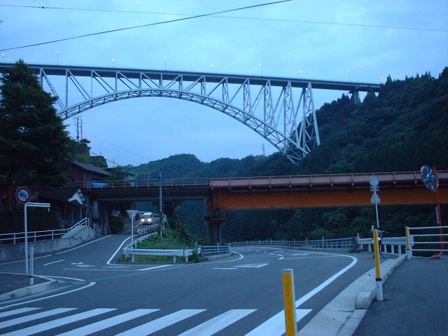 陽もドップリと落ちた頃、景勝地として名高い「青雲橋」のたもとに出た。これは日本で一番高い所にかかるアーチ橋だったかな・・・たしかに深い渓谷の上空を切り裂くように橋が架かっている。スンゴイ所に橋を架けるねー。