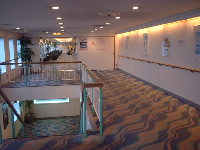 帰りの便はマリンエキスプレス日向19:00発:翌日18:20川崎着@22090円=大人+バイクである。この船かなり造りは豪華だ。スペースの取り方がゆったりとしていて優雅な気分になること請け合いである。わたしゃ2等なので関係ないが、畳敷きの部屋だったのでチョット嬉しかった。飯も3食オールバイキング方式で、朝昼なら800円で普通のホテルよりチトおちるくらいの飯が食える。コンビニ飯を持ち込んだので夕飯は食い損ねたが、夕飯は1500円だった。んー 食っときゃよかった。