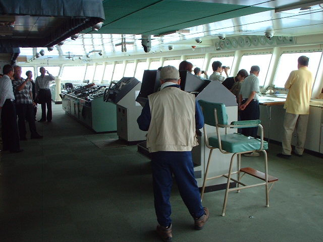 この便にパックツアーの老人の方がたくさん乗船していたせいもあるんだろうか、翌日昼間に、ブリッジの見学会が開催された。1時間くらい説明付きで操船室に入れちゃうのである。普段なら絶対に進入禁止の箇所である。爺さん婆さんが参加する中、若者は私一人だったがかまわず参加してみた。