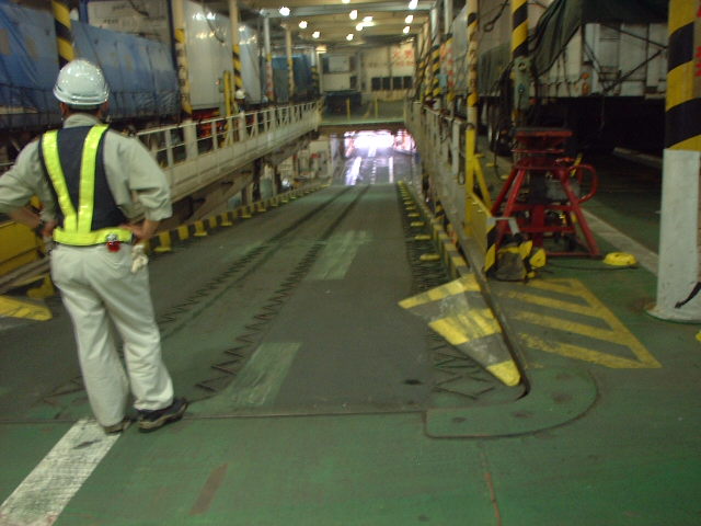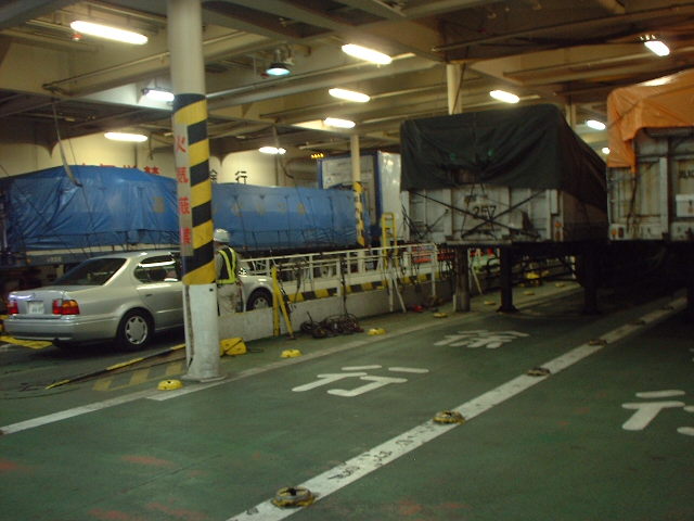 とりあえず下船したら首都高をとばして家に帰るだけなのだが、いままで下層甲板(車・トラックが載るところ)の写真を撮ったことがなかったので何枚か撮ることにした。床の一部が斜めに降りて、そこを下って船の外に出る造りになっている。待っているだけではヒマなので、ちょうどいい機会だと激写してみた。