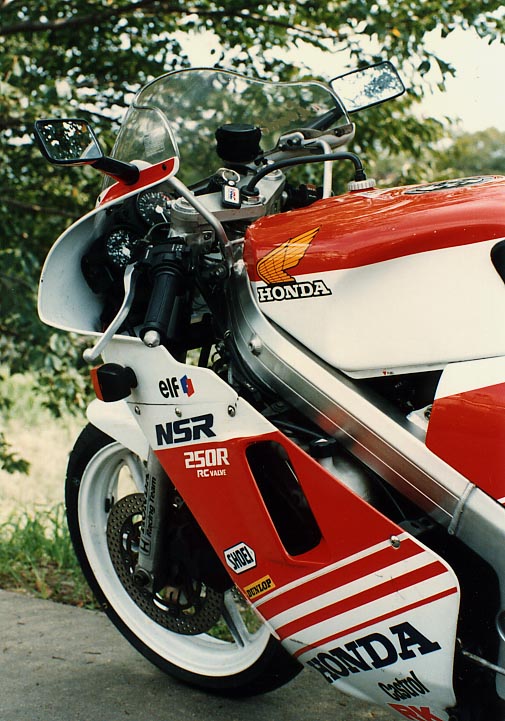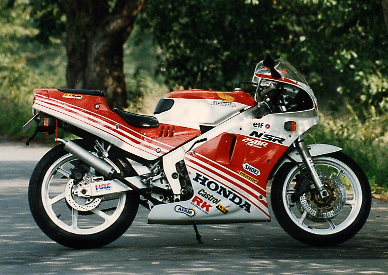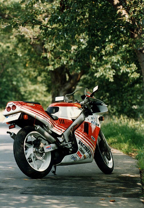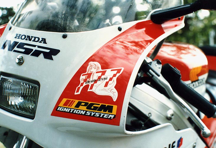 <右サイドからの引き> 兎にも角にも、むっちゃかっちょえーぞ マジで。 どう見ても市販車じゃないよな、この外見・・・シビレまくりです。 ステッカーは世界GP87年のHRC仕様です。 |