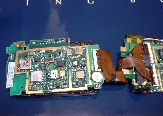 < 図 > 液晶裏基盤部アップ、上下基盤がフレキシケーブルで繋がっている。 SOはフレキシの処理が汚い、同じ二つ折りでもNECの方が一日の長。設計が綺麗なモノは性能も良し、って言われているけど正しいと思う。外見のデザインは「カワイイ!」なんて言われていても中の処理はこんなもんである・・・ |