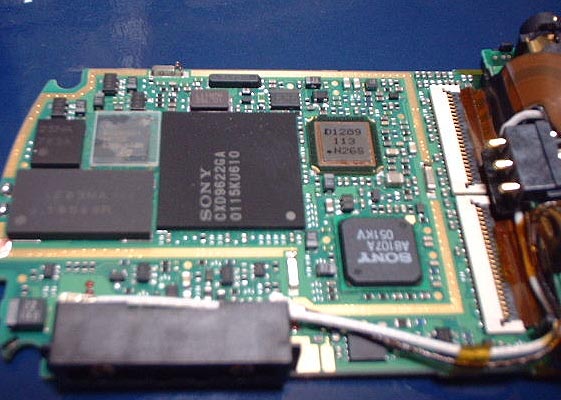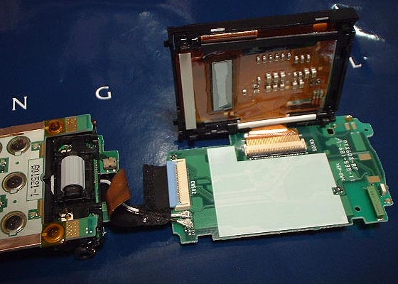 < 図 > 液晶を外してみる、フレキシはコネクタをうまーく外せばとれる。 ジョグダイヤルが基盤直に付いているのも確認できる。 |