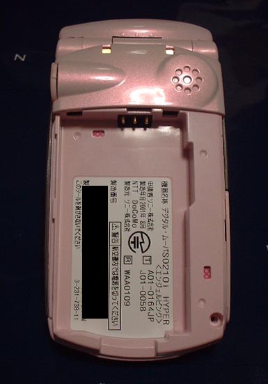 <左> 電池カバーを外すと1カ所だけネジ穴。(外した後) 貼ってあるのは製造番号シールだよ。 2mmくらいの赤い×マークっぽいのが覗いている窓が、いわゆる 「水没反応シール」 ここが滲んでいると水分が入った目安となる <右> とりあえず下の部分だけ外してみた。 ケース内側の金属板はシールドなんだろうな。 |