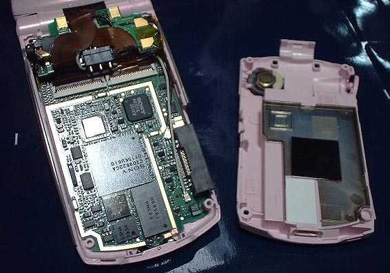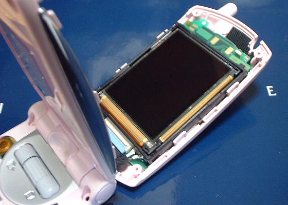<左> 液晶部分のケースバラシ。ピックを入れると「パッキ!」とはずれる。 うまくやらないとケースが割れるよ。 <右> SO211iはリア側に基盤がはまっている。 通常はフロントにくっついていることが多い。 |