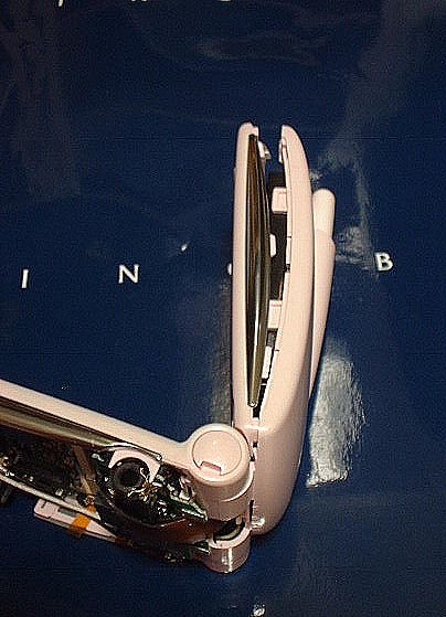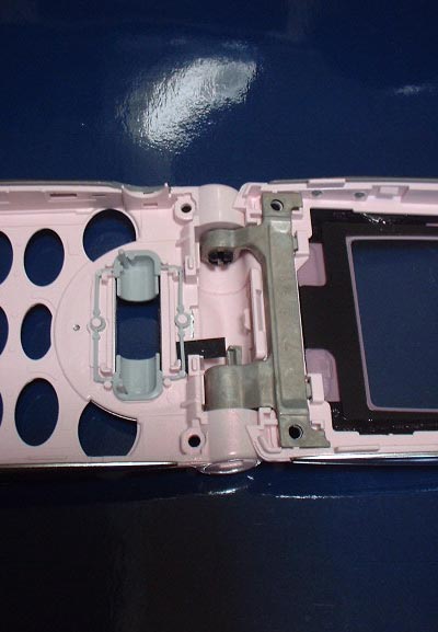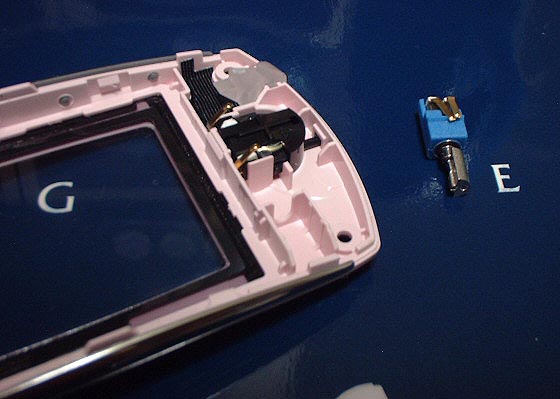 <左> フロント上部にバイブレータユニット。(青いやつ) 青の先の銀の金属部分が回転してゆらすんだよ。 <右> 折り畳みのヒンジ部に補強の金属板。 NECだと、ここら辺のノウハウが結構あるらしくて、ケースだけで強度を保っているんだけどな。P503iSなんかも金属ジョイント補強アリである |